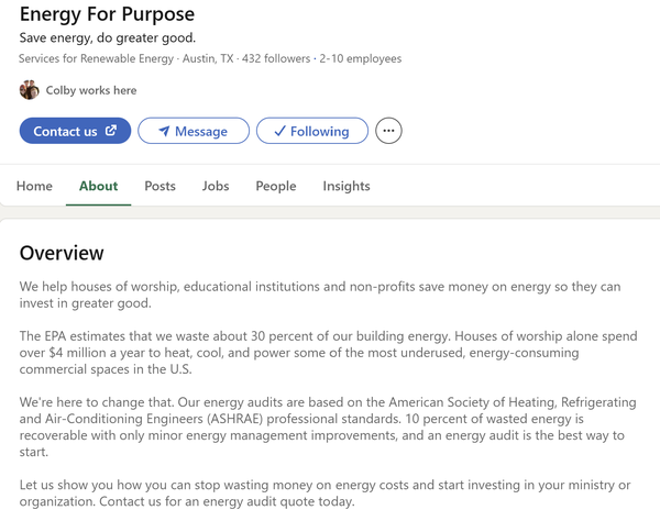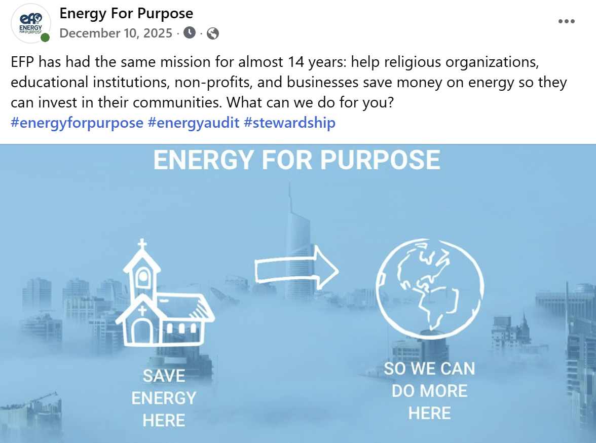 This year, Energy for Purpose will celebrate 14 years of helping houses of worship, schools, seminaries, universities and businesses save money on utilities and invest in their organizations.